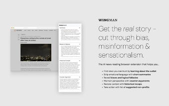 Wingman to rozszerzenie przeglądarki Chrome opracowane przez Context Corp Venture Studio. Ten darmowy narzędzie ma na celu pomóc użytkownikom przełamać uprzedzenia, dezinformację i sensację w wiadomościach online. Oferuje funkcje takie jak znalezienie wiarygodnych źródeł informacji poprzez poznanie danej platformy, dostarczanie krótkich podsumowań pozbawionych emocjonalnego języka oraz ujawnianie stronniczości i błędów logicznych.